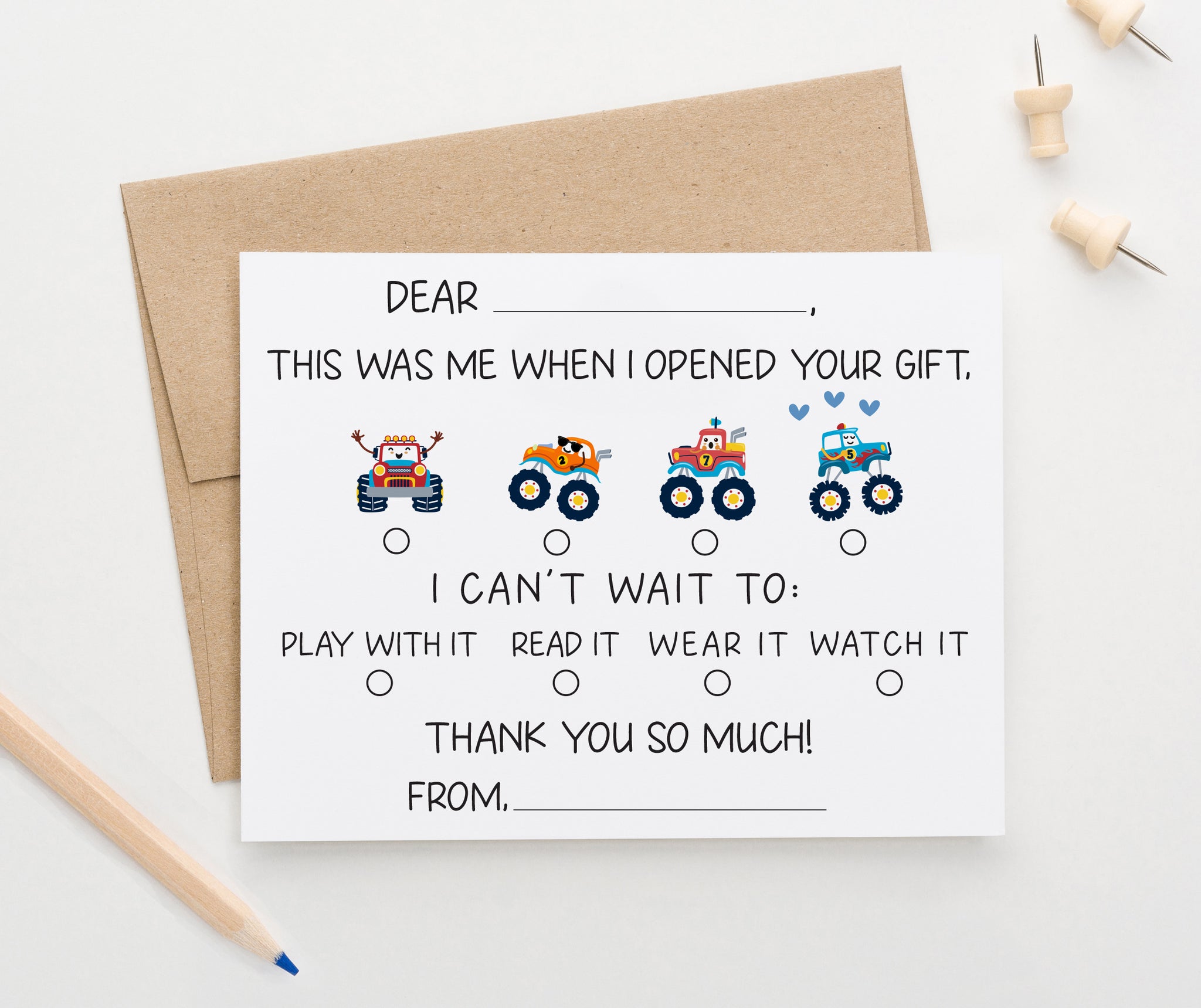 Our Fill In The Blank Thank You Cards feature action-packed monster truck clip art that makes every note feel like a thrill ride. The easy fill-in format helps kids confidently say thanks after birthday parties, celebrations, or monster truck-themed events. These Fill In The Blank Thank You Cards turn good manners into a fun, high-octane activity they'll actually enjoy.