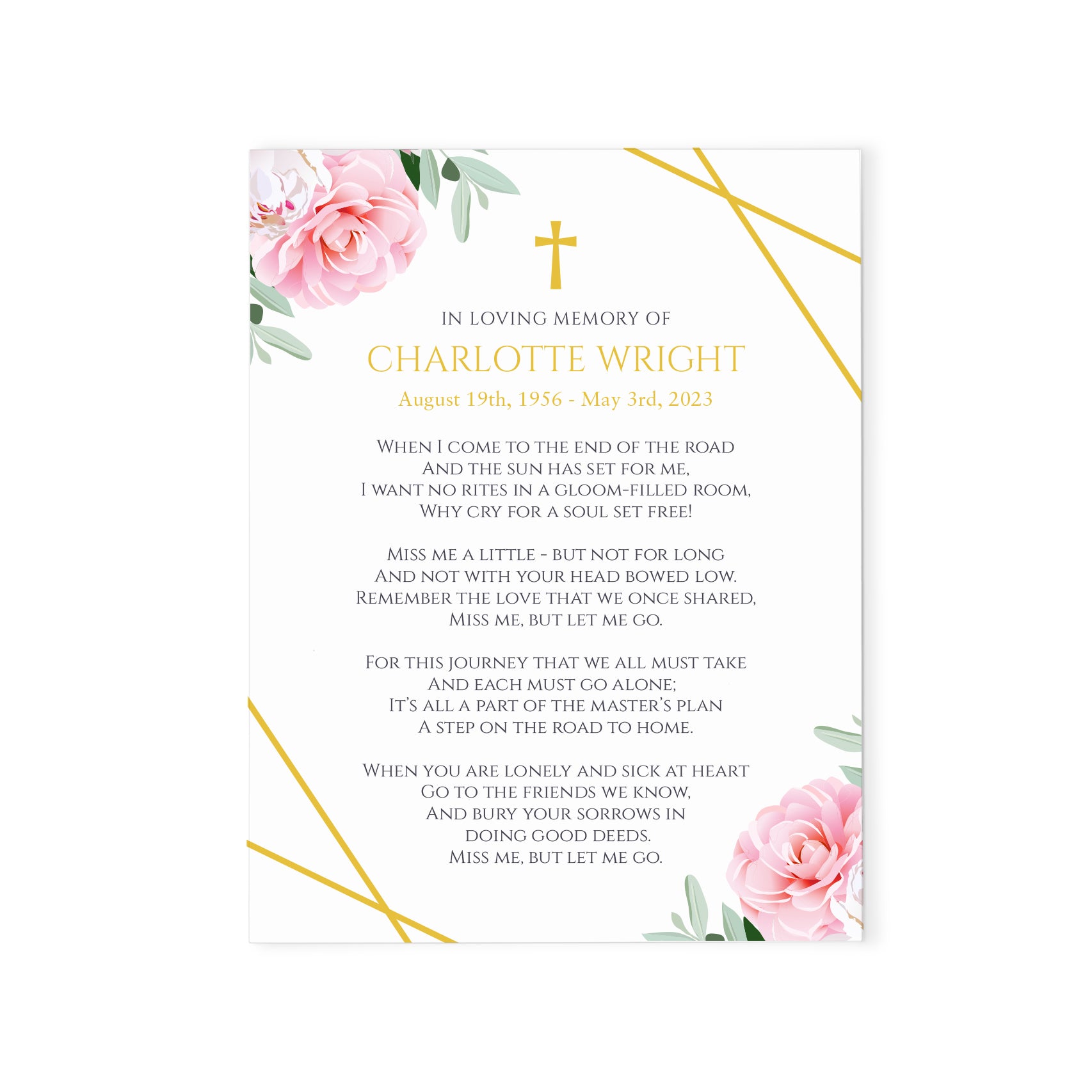 Our Celebration Of Life Prayer Cards feature delicate pink watercolor flowers and elegant gold lines along the corners, creating a serene and heartfelt design. These cards offer a touching way to honor a loved one, providing comfort and remembrance. Choose our floral-themed Celebration Of Life Prayer Cards for a meaningful and elegant tribute.